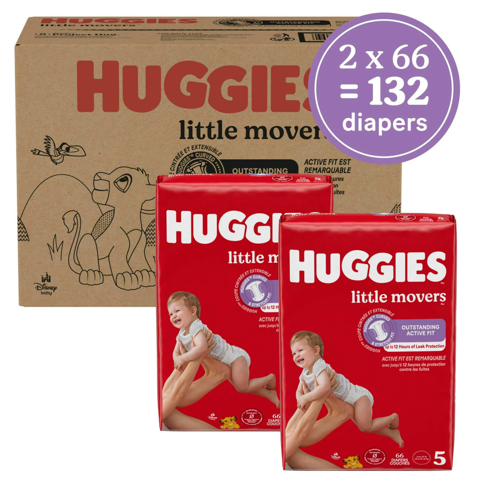 Couches pour bébés Little Movers imprimées en pâte fluff, protection anti-fuites, douces et respirantes, taille 5 (7-8 kg), paquet de 132 unités