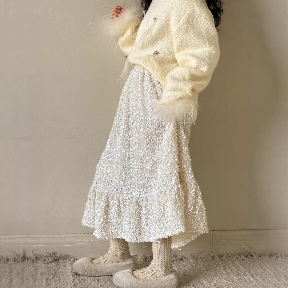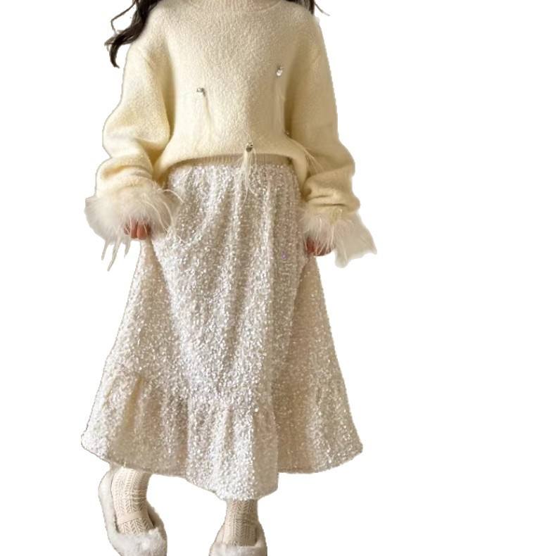 Jupe à paillettes pour fille Little Red Fish, nouvelle collection hiver 2026, jupe longue mi-mollet haut de gamme pour enfants, épaissie, style parapluie blanc, en Spandex/Coton