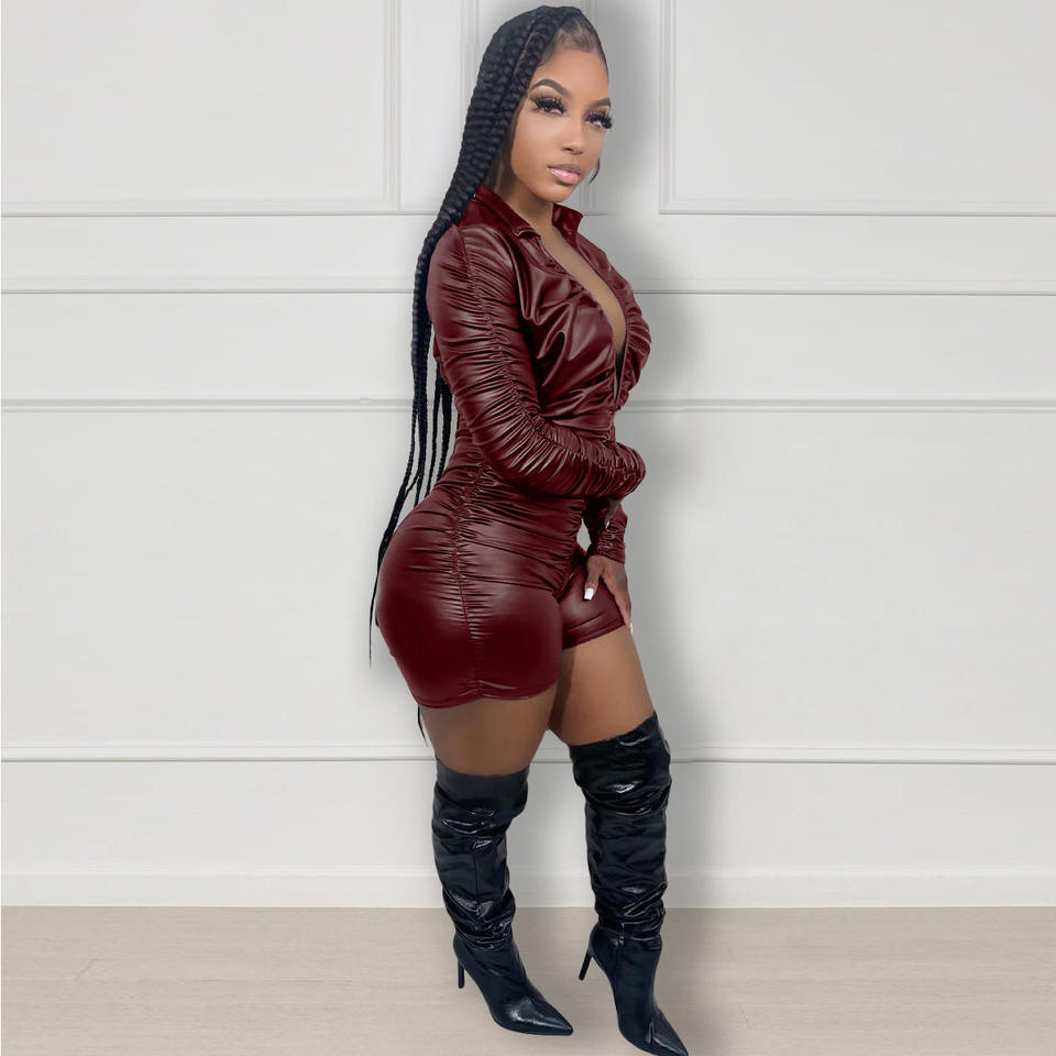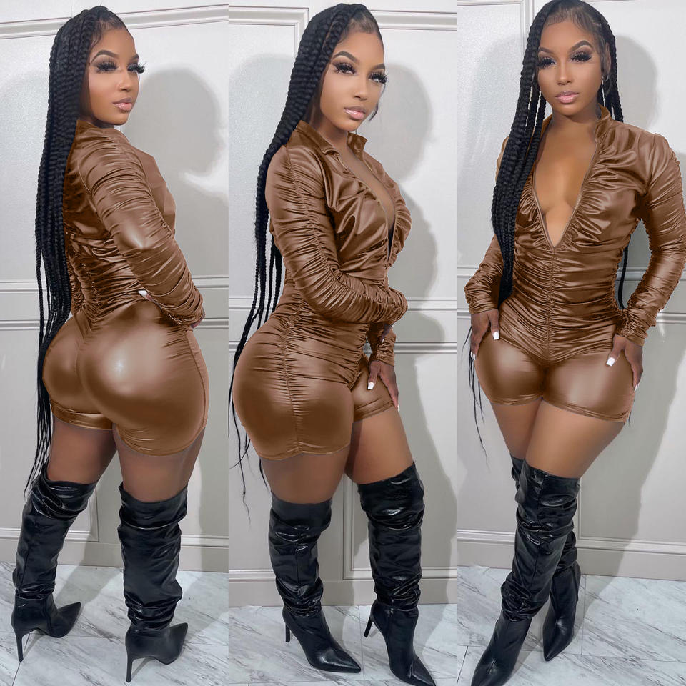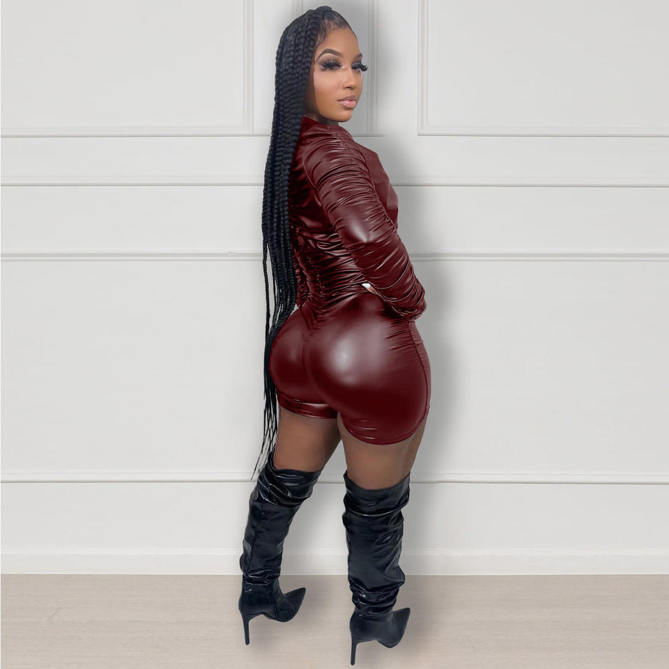 Liu Ming New Products Women Pu Faux Leather Long Sleeve Playsuit Bodycon One Piece Rompers Jumpsuit