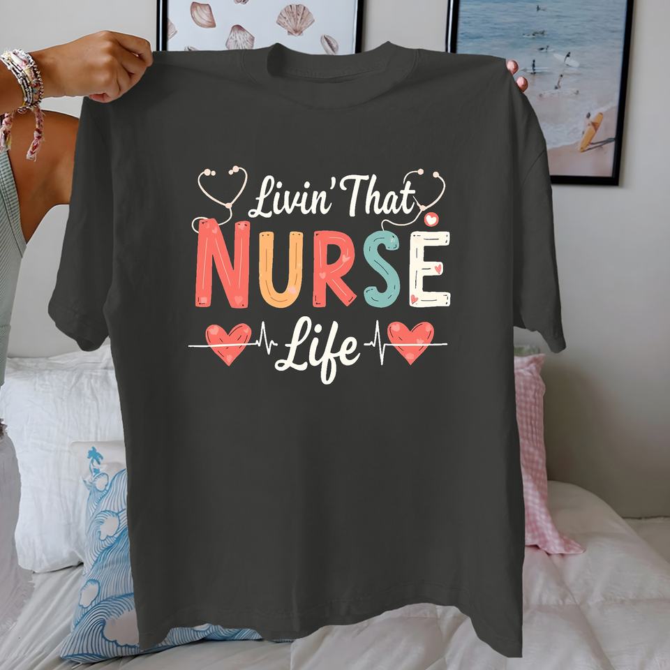T-shirt décontracté pour femme avec imprimé stéthoscope « Livin That NURSE Life », 100 % coton, tissu tricoté, coupe confortable