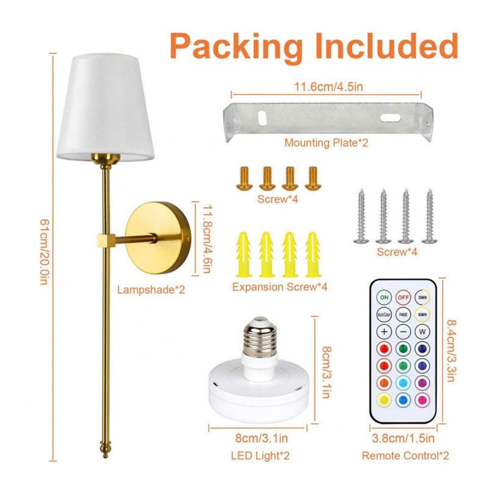 Applique murale d'intérieur dorée RGB à intensité variable sans fil, fonctionnant sur batterie, avec télécommande, lot de 2 lampes murales rechargeables