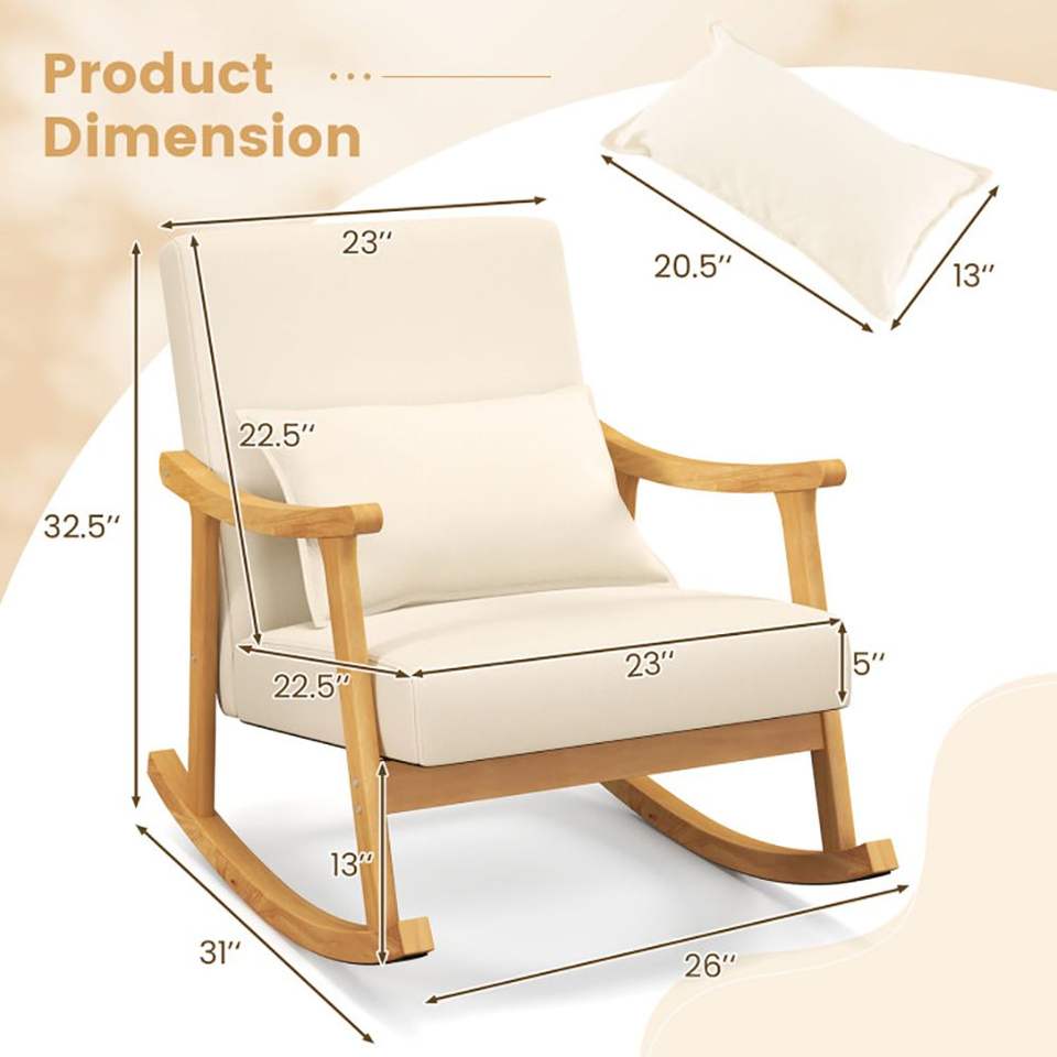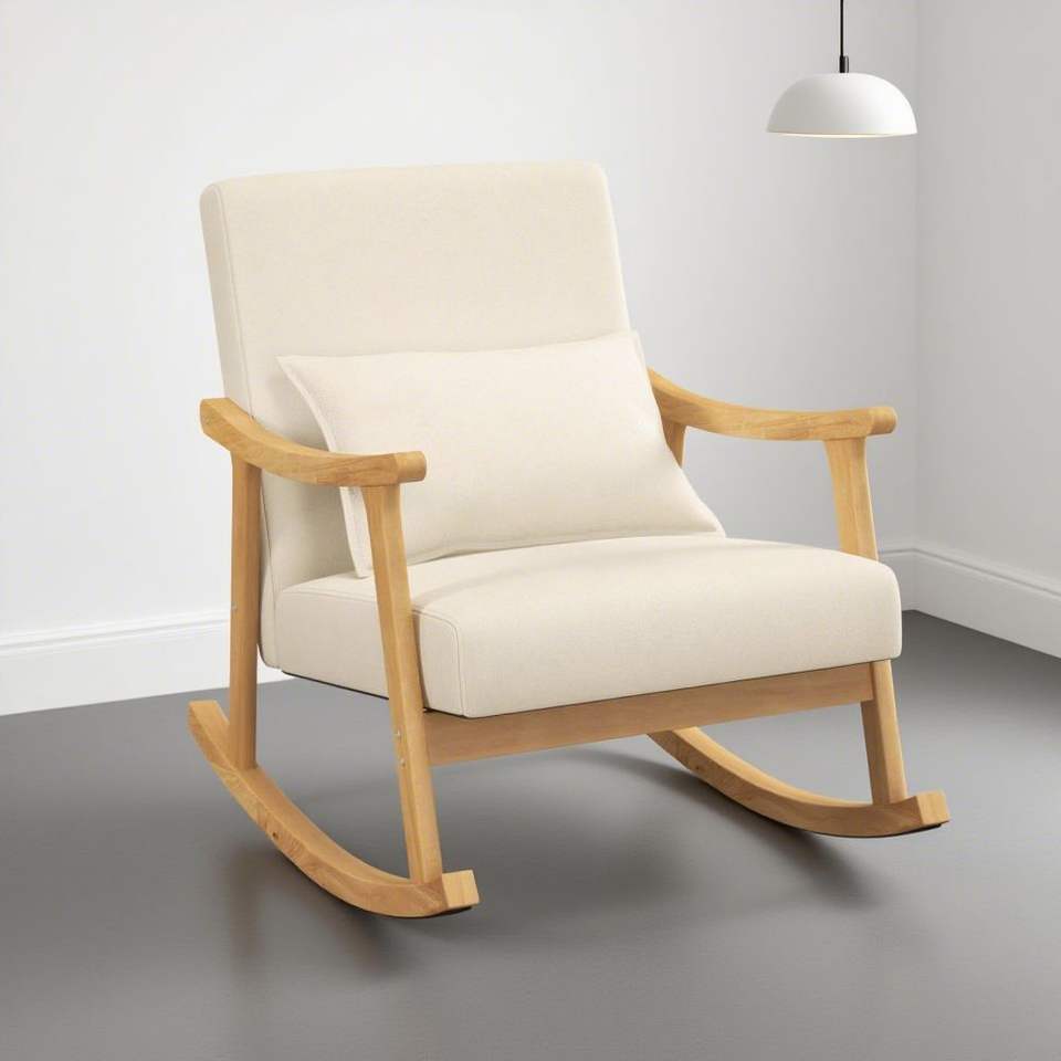 Fauteuil à bascule rembourré pour salon avec coussin et structure en bois d'hévéa