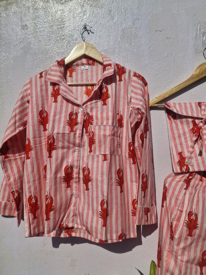 Ensemble de pyjama en coton à imprimé homard pour femmes | Pyjama indien rayé fait main | Vêtements de détente en mousseline douce