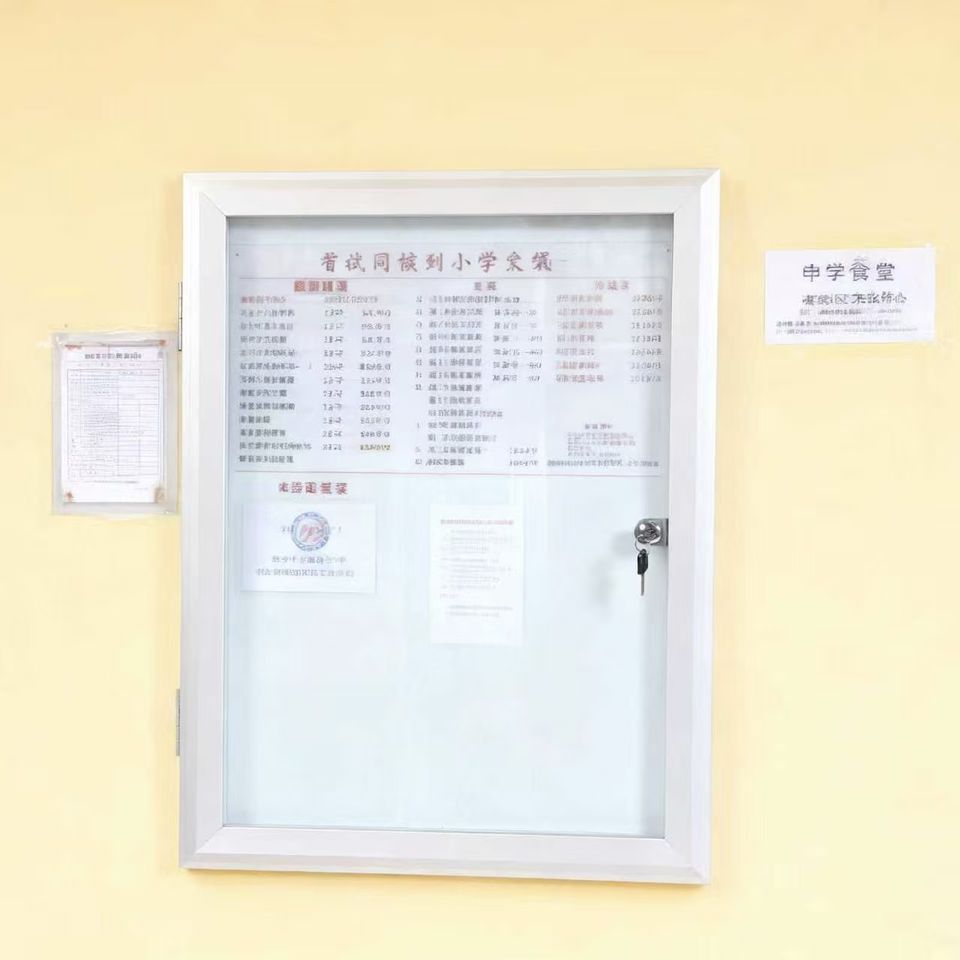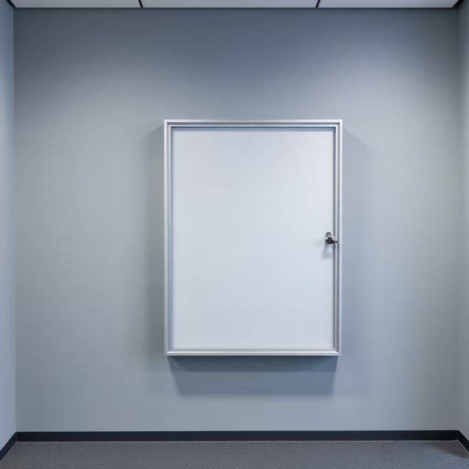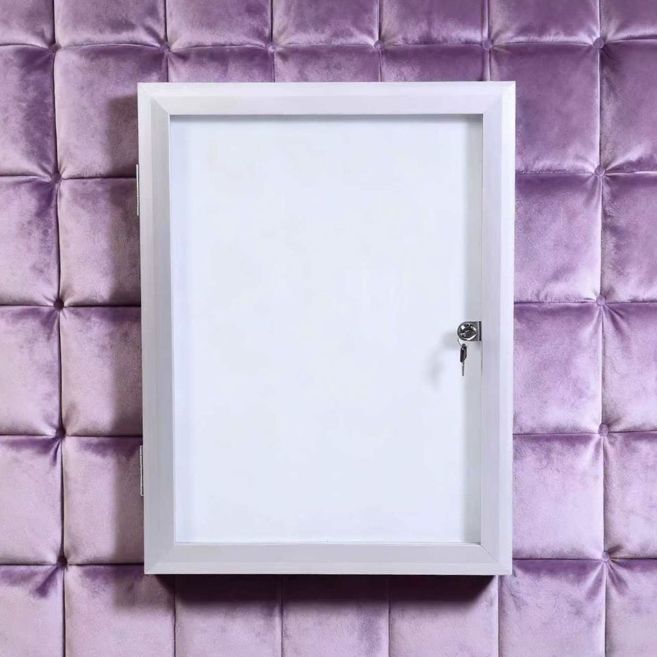 Vitrine murale verrouillable avec cadre en aluminium blanc et porte transparente pour une présentation sécurisée des informations