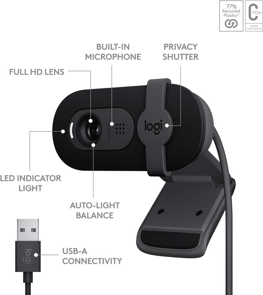 Logi-tech Brio 101 Full HD 1080p Webcam Balance de lumière automatique Micro intégré Obturateur de confidentialité USB-A pour les équipes Google Meet CMOS Image