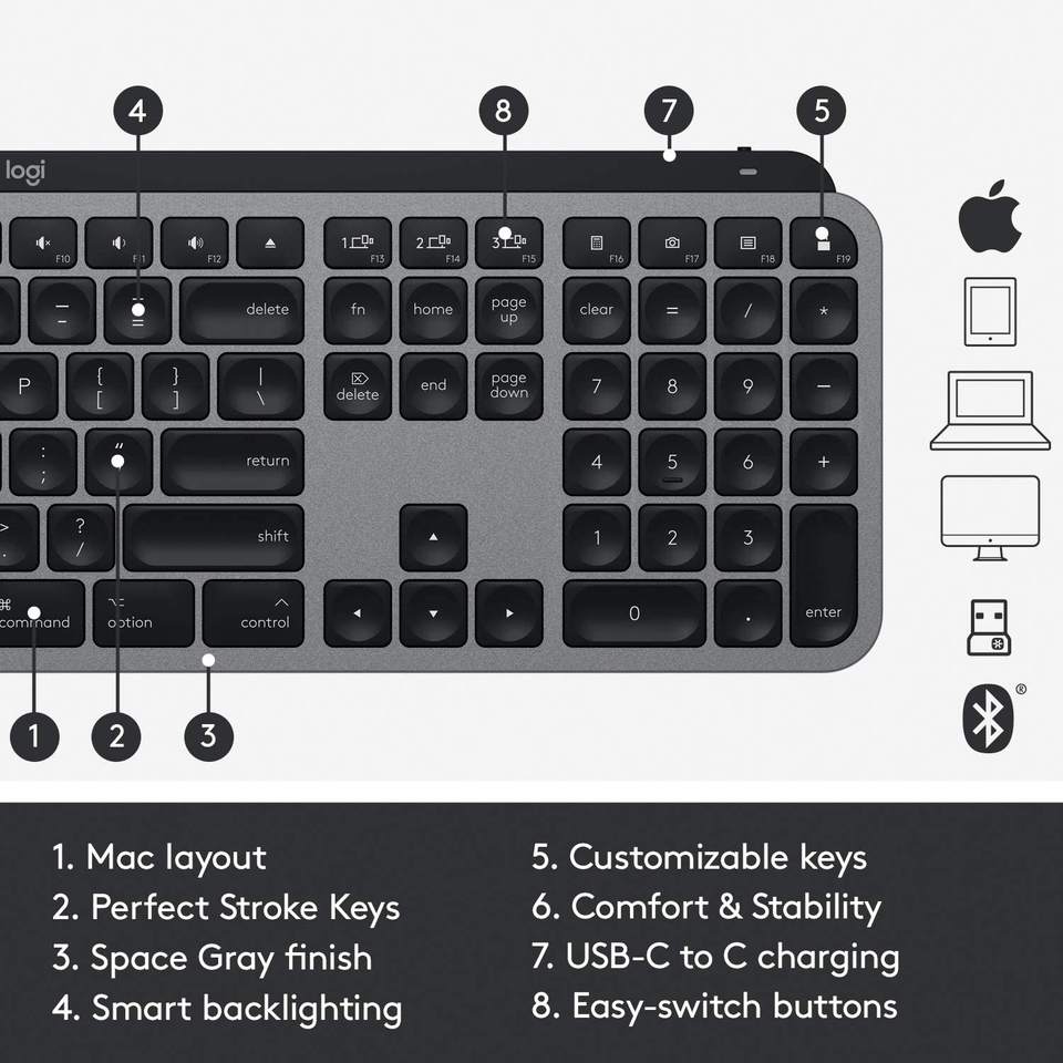 Clavier sans fil illuminé avancé Logitech MX Keys pour Mac - Blue Tooth/USB