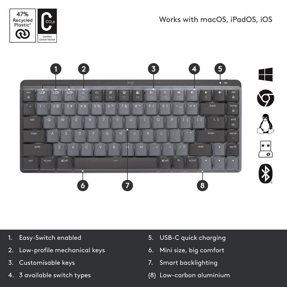 Clavier sans fil Logitech MX Mechanical Mini, interrupteurs tactiles silencieux, rétroéclairé, USB-C