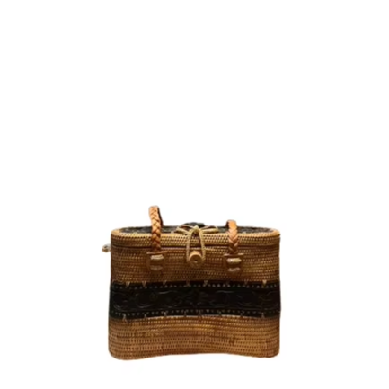 Lombok Heritage Handwoven Ketak Wicker Craft Bag with Carved Wood Accent Traditional Indonesian Style Leather Rope Handle
