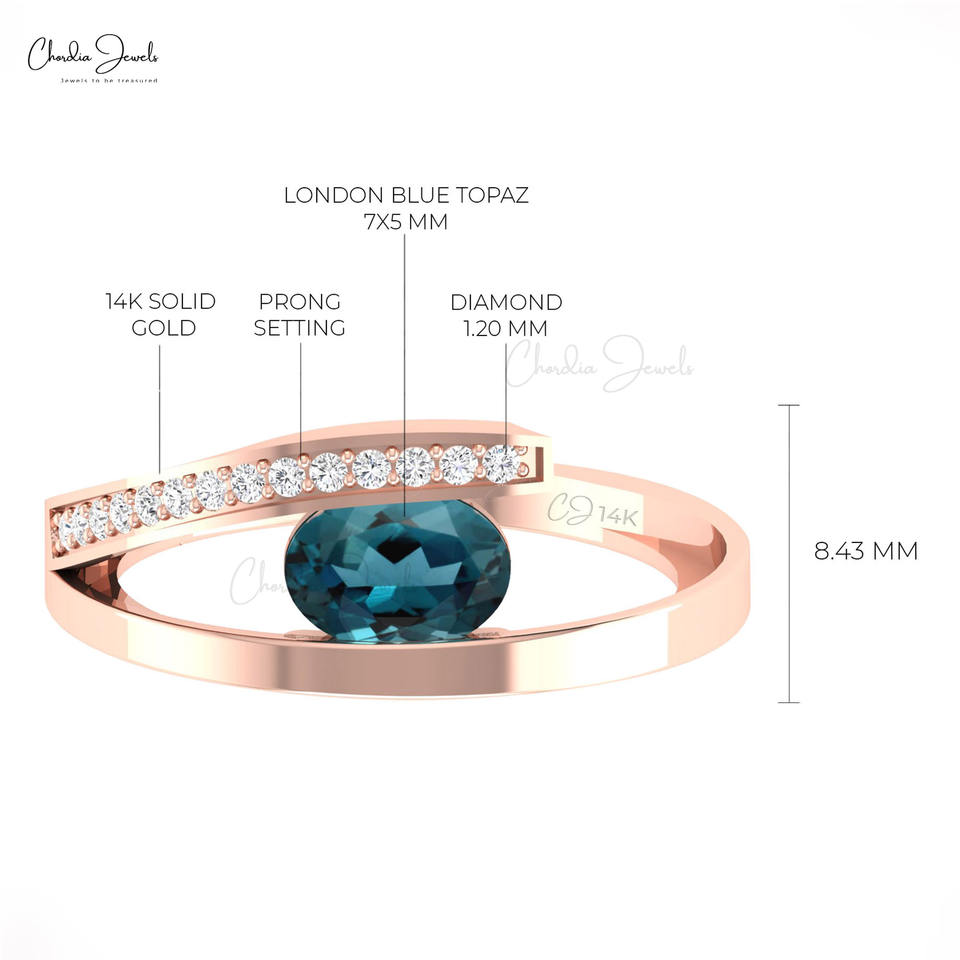 Bague à tige fendue en topaze bleue de Londres cloutée avec un diamant blanc de 0,10 ctw Bague en pierre précieuse ovale de 7x5mm en or pur 14 carats Expédition express