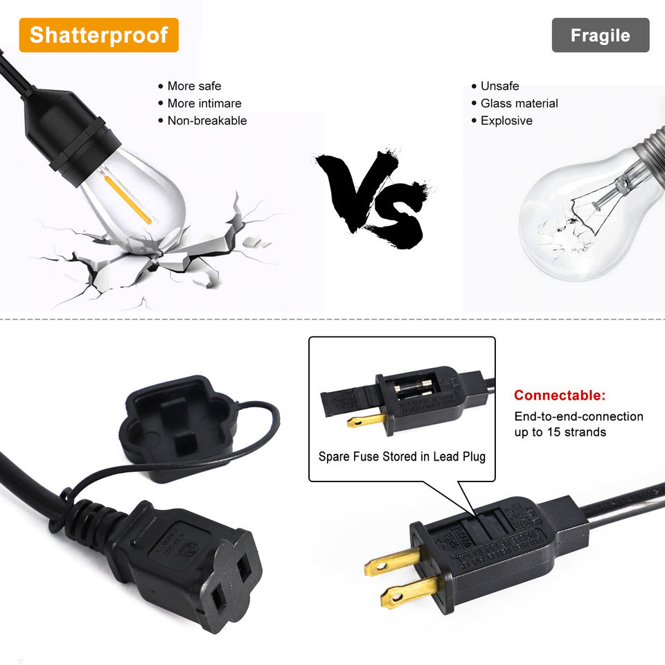 Guirlandes lumineuses LED décoratives longues, étanches pour l'extérieur, avec prise américaine homologuée ETL