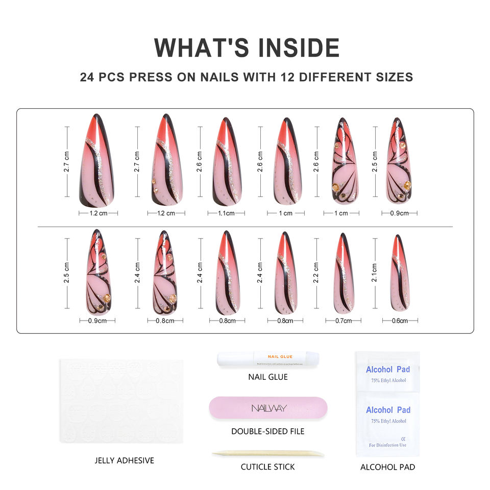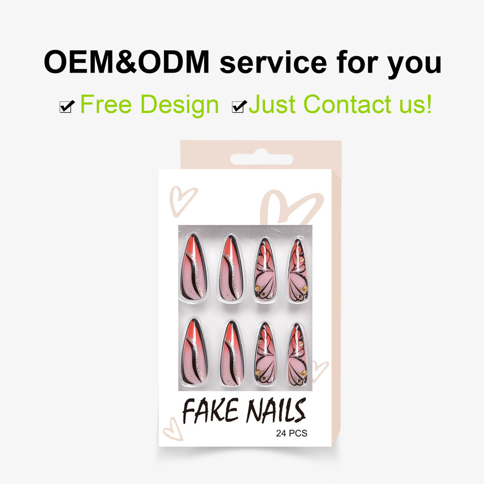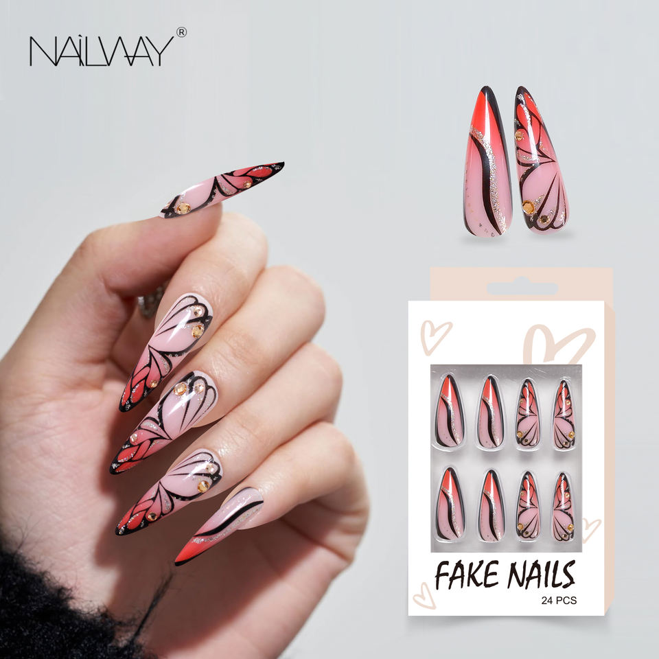 Longue durée 24 pièces ABS Super long Stiletto papillon conception dureté presse sur faux ongles coller sur les ongles avec diamant