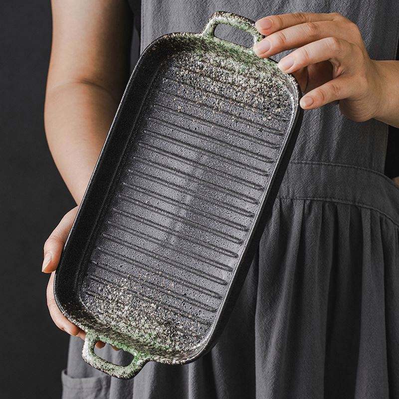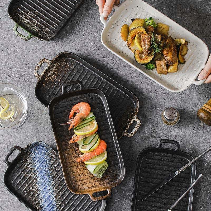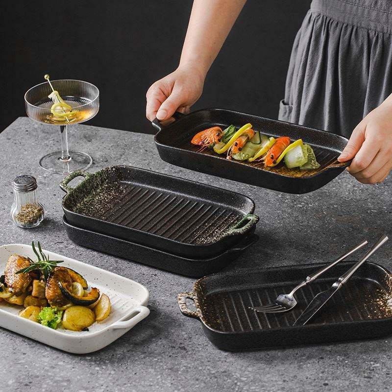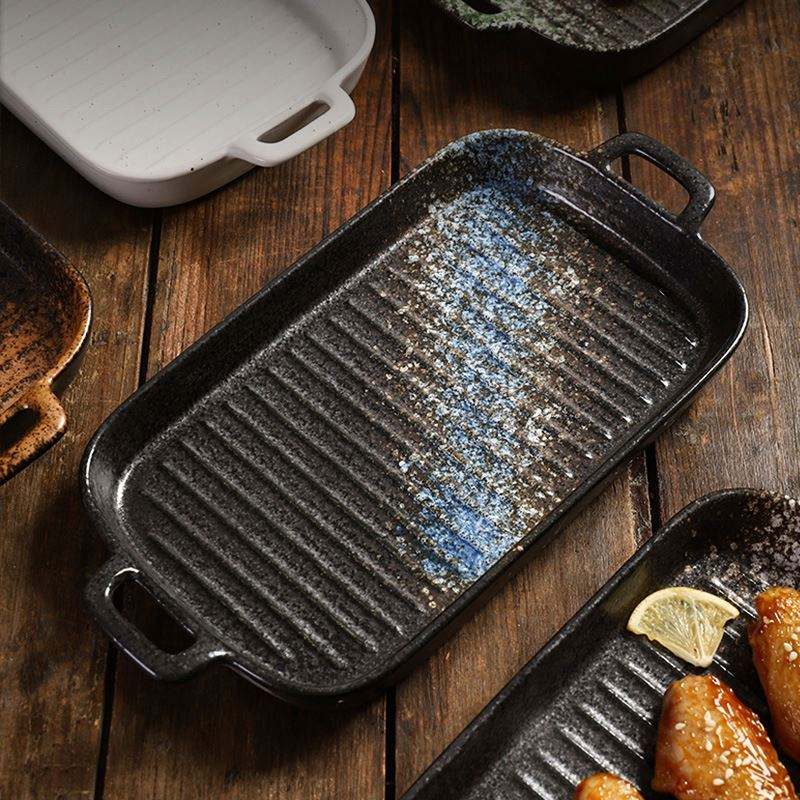 Long Rectangular Striped Casserole Baking Tray Non-Stick Double-Handled Rectangular Baking Tray Pizza Ceramic Plate
