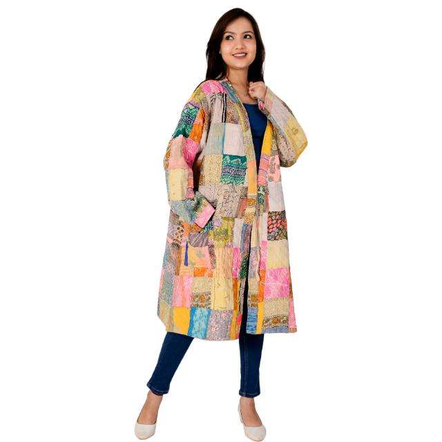 Long manteau en soie Boho matelassé Patchwork Vintage Kimono veste, blazer en soie crêpe fait main pour femme, taille unique et coupe grande taille