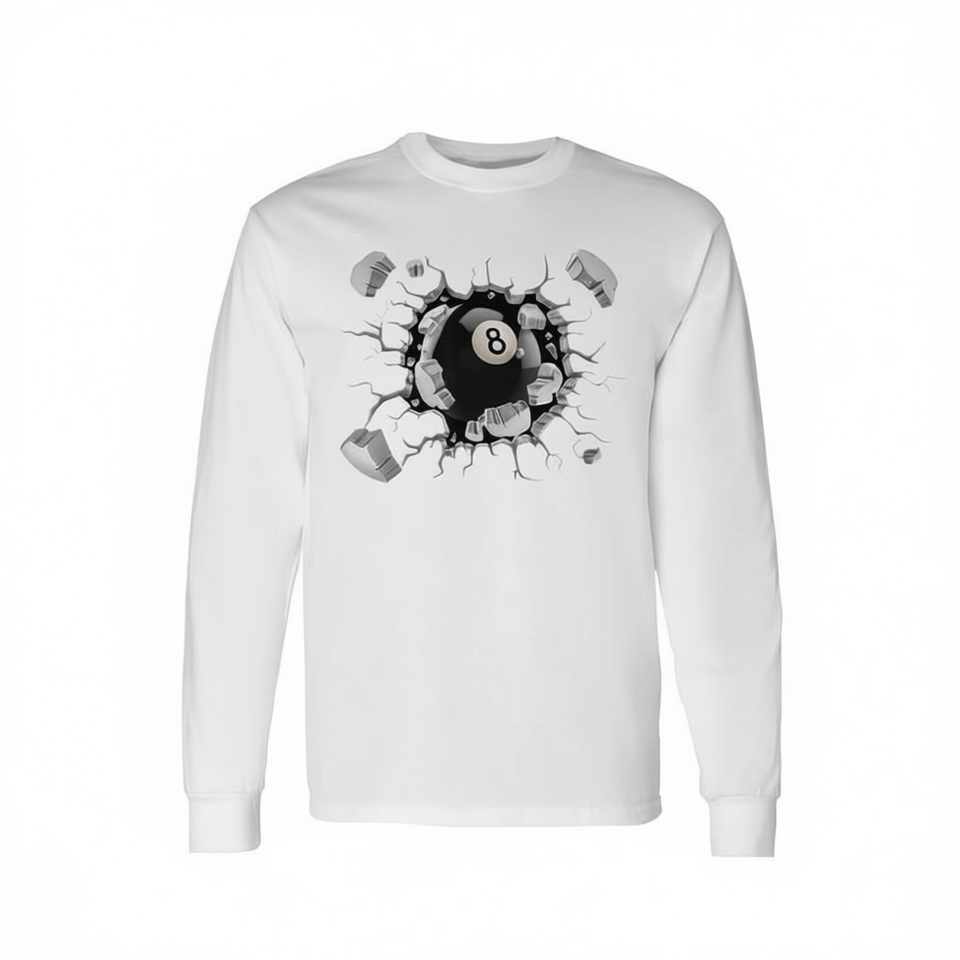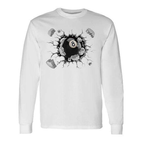 T-shirt promotionnel à manches longues avec motif explosion de billes de billard 8 ball sur la poitrine