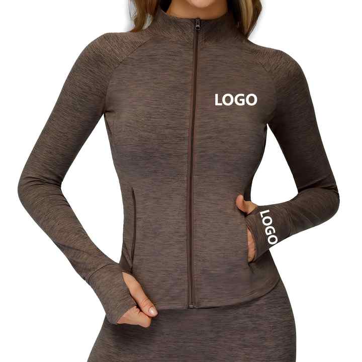 Vêtement de sport écologique à manches longues, coupe ajustée, avec logo sur le devant, fermeture éclair intégrale, pour activités de plein air, yoga, séchage rapide, col montant
