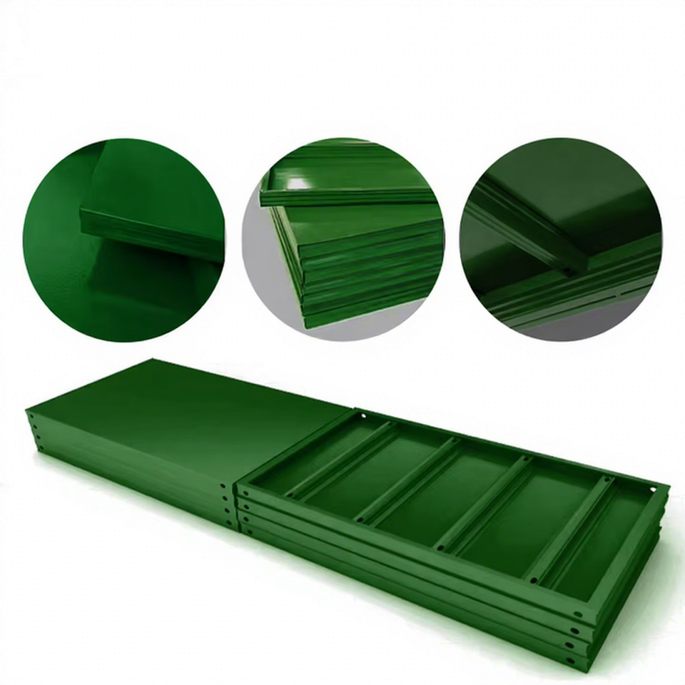 Étagère d'entrepôt à un niveau en acier inoxydable à longue portée, sans boulons, à montage facile, avec finition thermolaquée et épaisseur de 5 mm