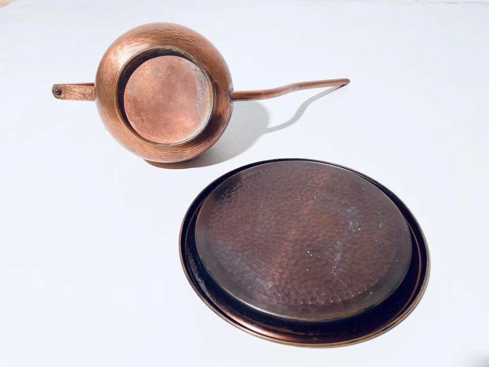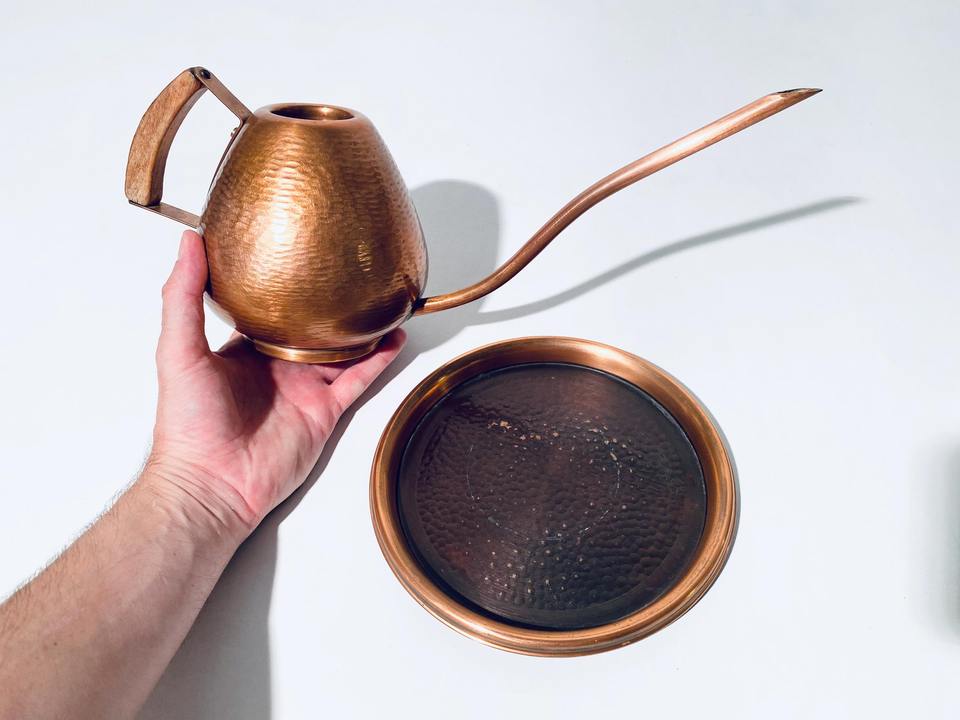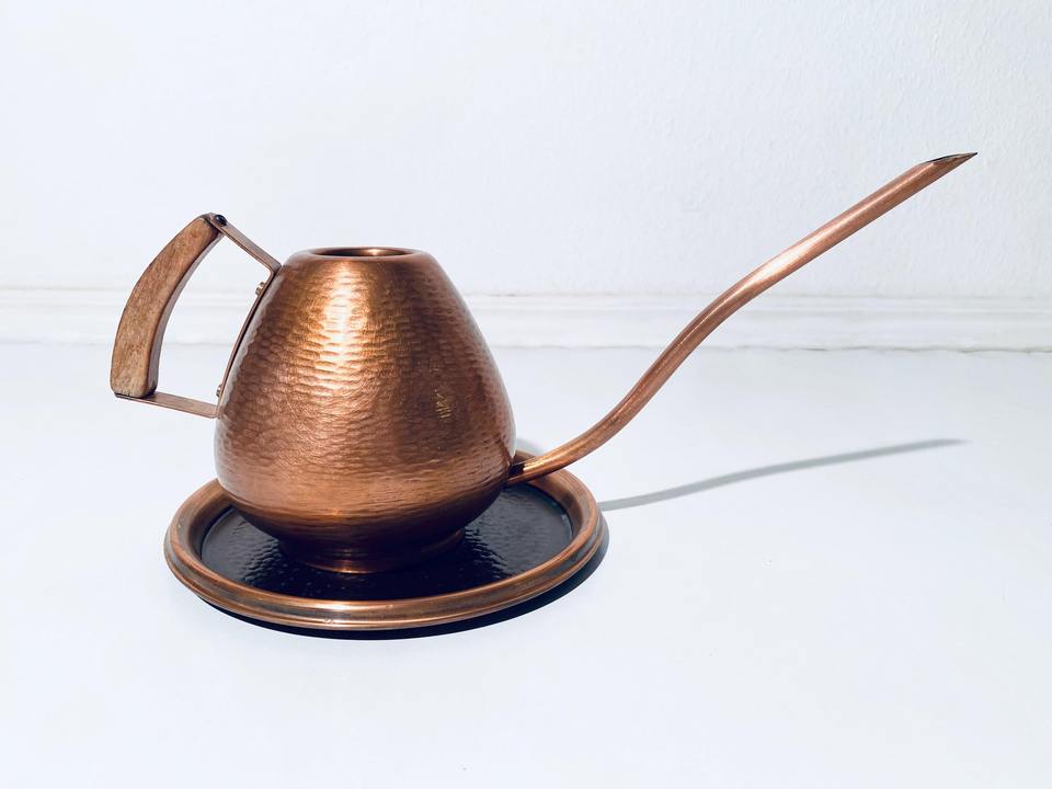 Arrosoir en cuivre à long bec avec poignée en bois et plateau pour plantes d'intérieur, usage décoratif pour balcon, fabriqué à la main en Inde