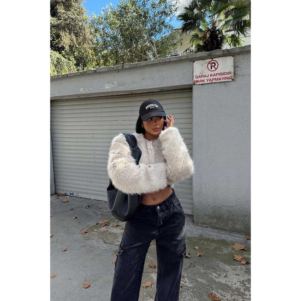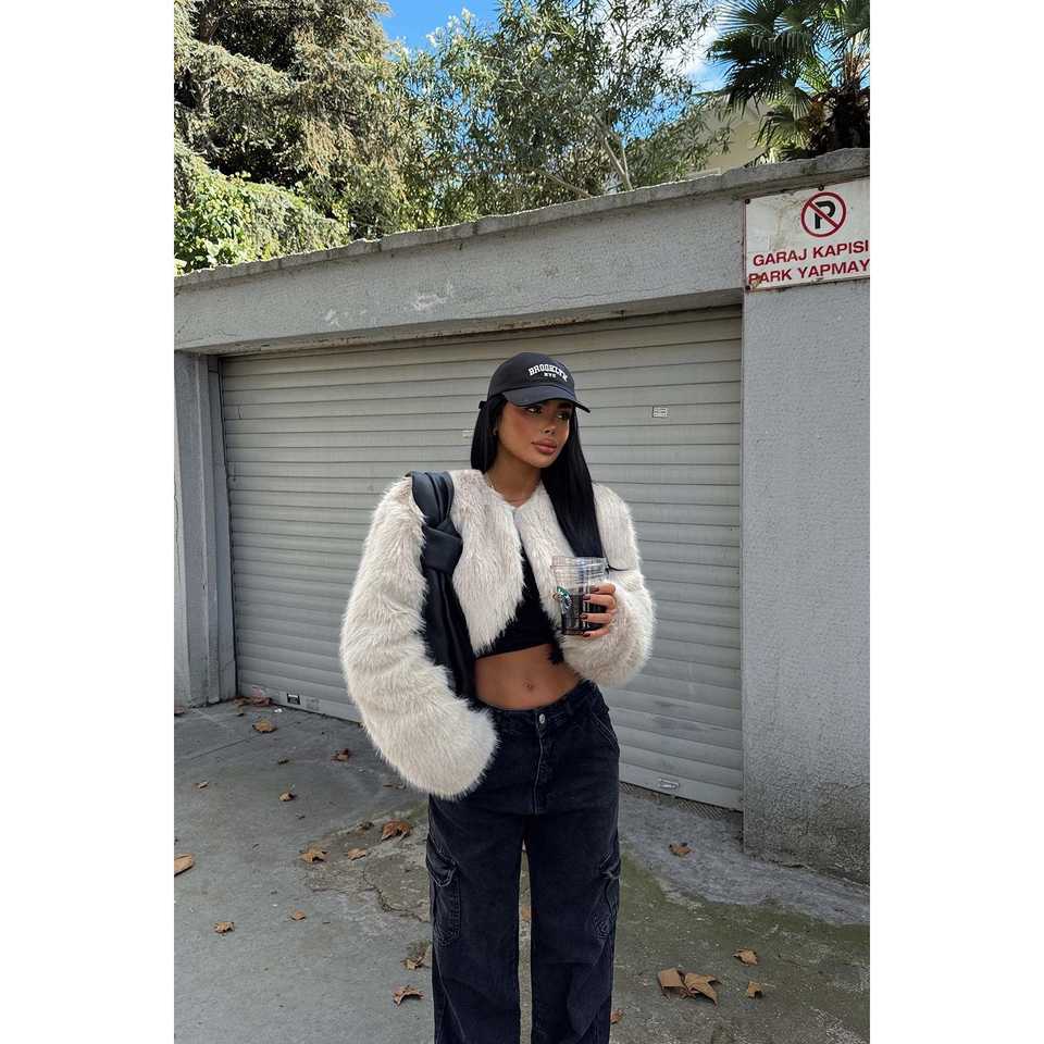 Manteau long en fourrure de lapin crème et laine enduite de soie à poils courts avec motif imprimé, fermeture à simple boutonnage et ceinture
