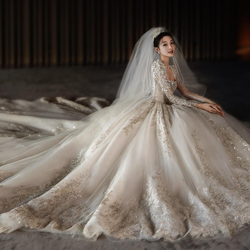 Robe de mariée principale à manches longues nouvelle mariée grande queue industrie lourde française haut de gamme petit Style Satin