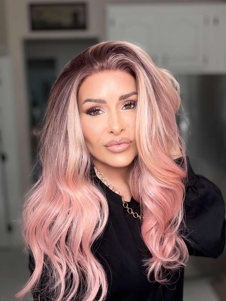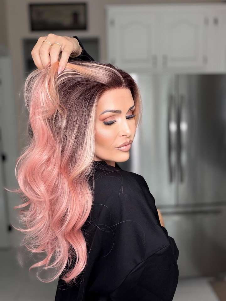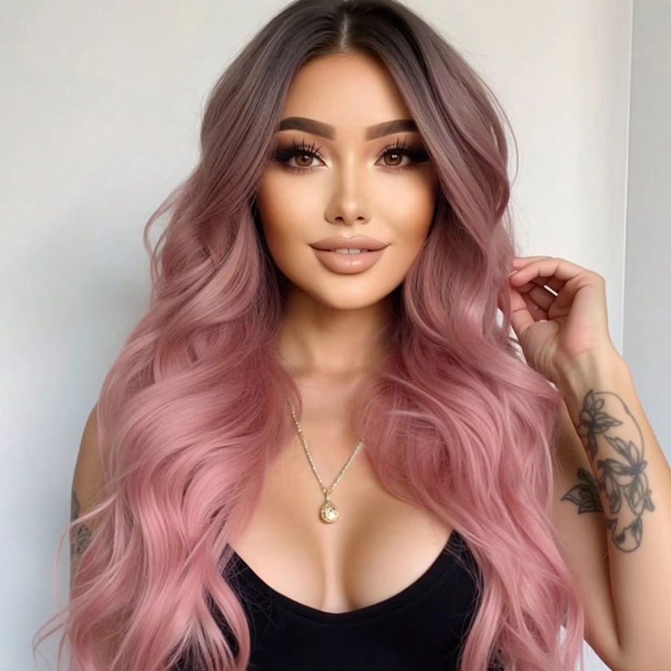 Perruque synthétique rose pêche mi-longue, ondulée italienne, aspect naturel, pré-épilée, avec dentelle frontale 13x4, transparente et sans colle