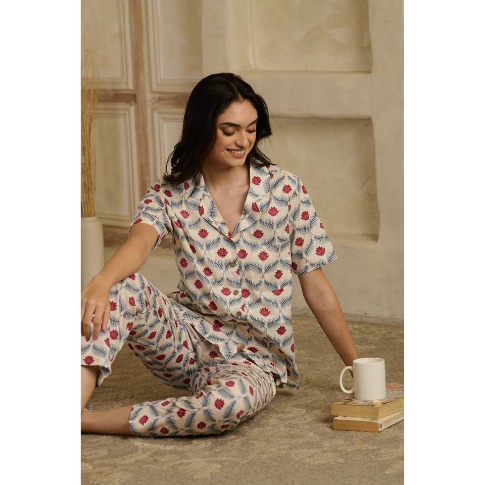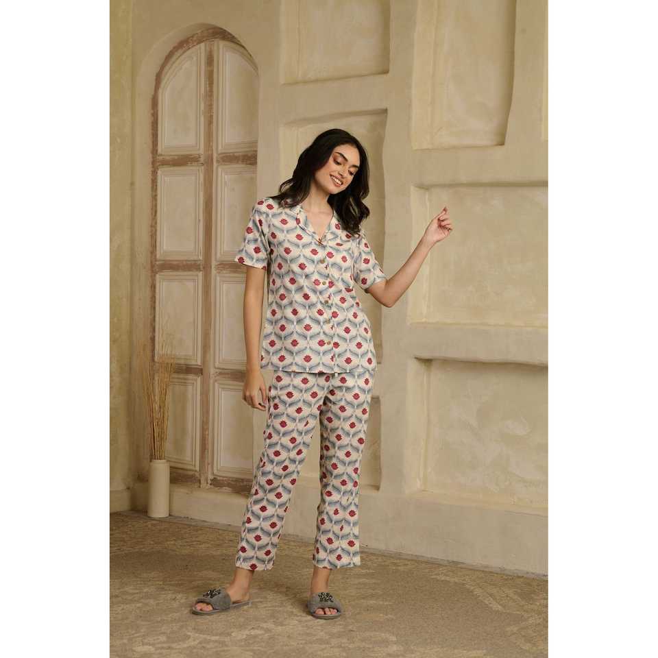 Ensemble de pyjama pour femmes Lotus Rouge ODM avec logo personnalisé, tissu tissé respirant, taille élastique avec cordon de serrage, taille plus, imprimé, 100% coton