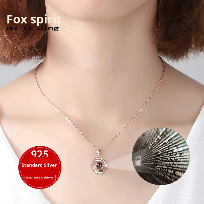 Collier en argent S925 avec chaîne en os de serpent rose, style naturel, pour femmes, pendentif de projection « Je t'aime » en 100 langues