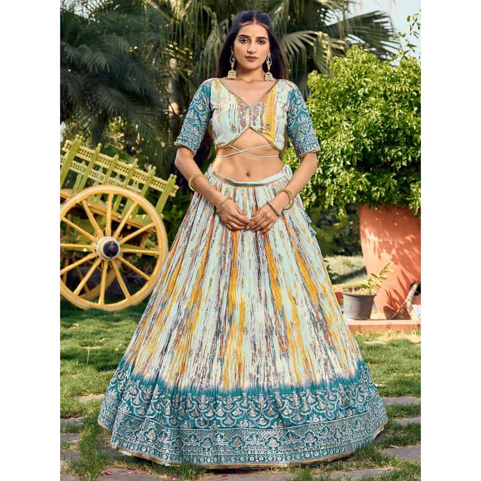 Lovely White & Blue Digital Printed Chinon Sangeet Wear Lehenga Choli