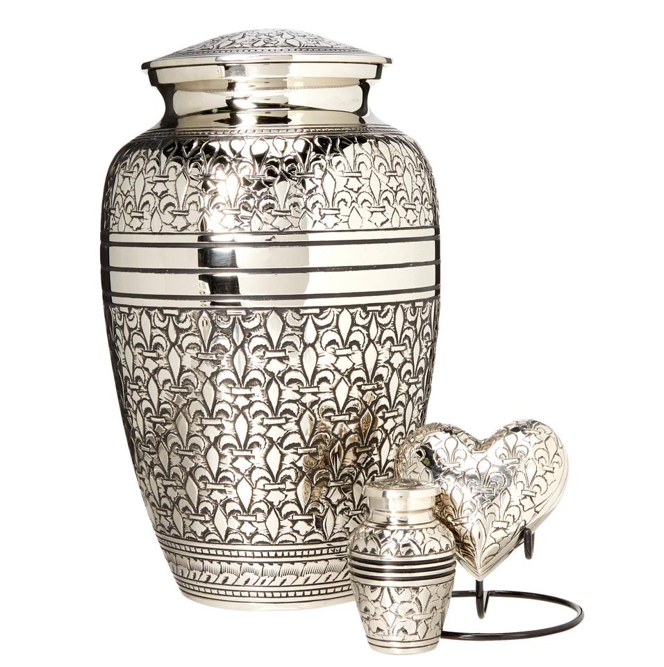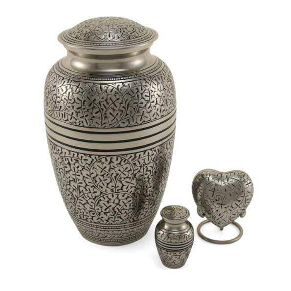 L'ensemble d'urnes solides commémoratives aimantes est la collection d'urnes en métal grec qui comprend une urne adulte pleine grandeur, un jeton et un cœur souvenir