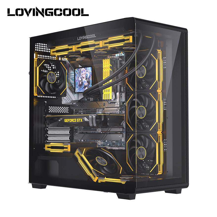Boîtier d'ordinateur Lovingcool Full Tower, compatibilité large des cartes mères E-ATX à ITX, double verre trempé, refroidissement par eau 360 mm