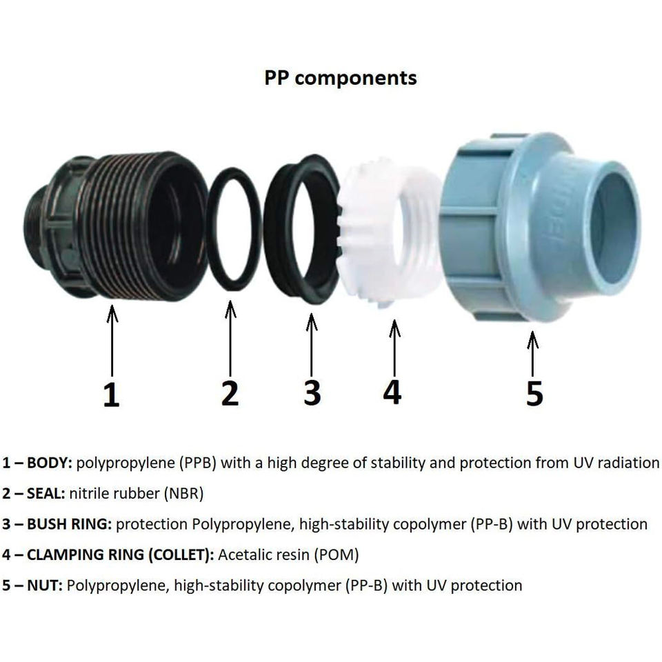 Raccord de compression en plastique mâle droit basse pression 40x1 pour application fluide Matériau PP et PVDF Taille 16mm
