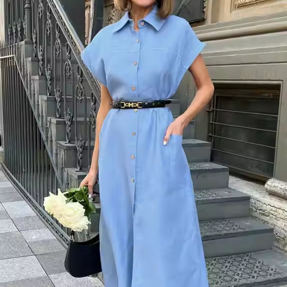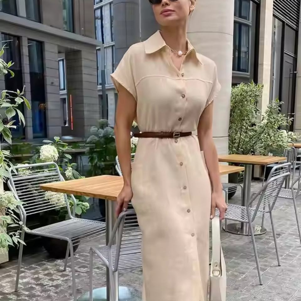 Robe d'été personnalisée à col rabattu et manches courtes en lin et coton pour femme, avec logo, à prix réduit, en promotion