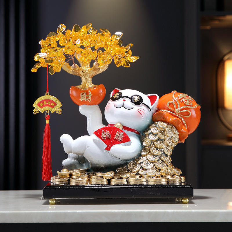 Ornement Arbre de la Fortune Chat Porte-Bonheur en Résine Époxy Sculptée pour Cadeaux d'Affaires Haut de Gamme, Célébration de l'Installation d'une Nouvelle Maison ou Bureau