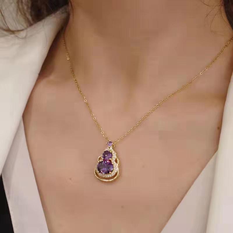 Lucky Inlaid Zircon Purple Crystal Gourd Necklace Exquisite 18k Gold Plated Stainless Steel Crystal Gourd Pendant Necklace