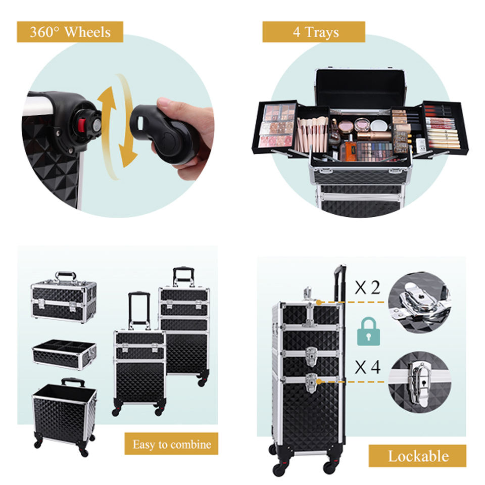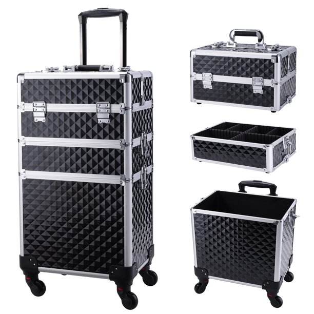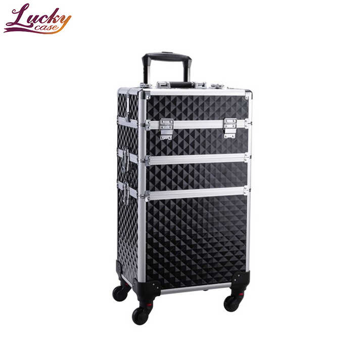 Valise à roulettes en aluminium Lucky Pro avec tiroir verrouillable 3 en 1, poignée souple, grand rangement, organisation facile des cosmétiques