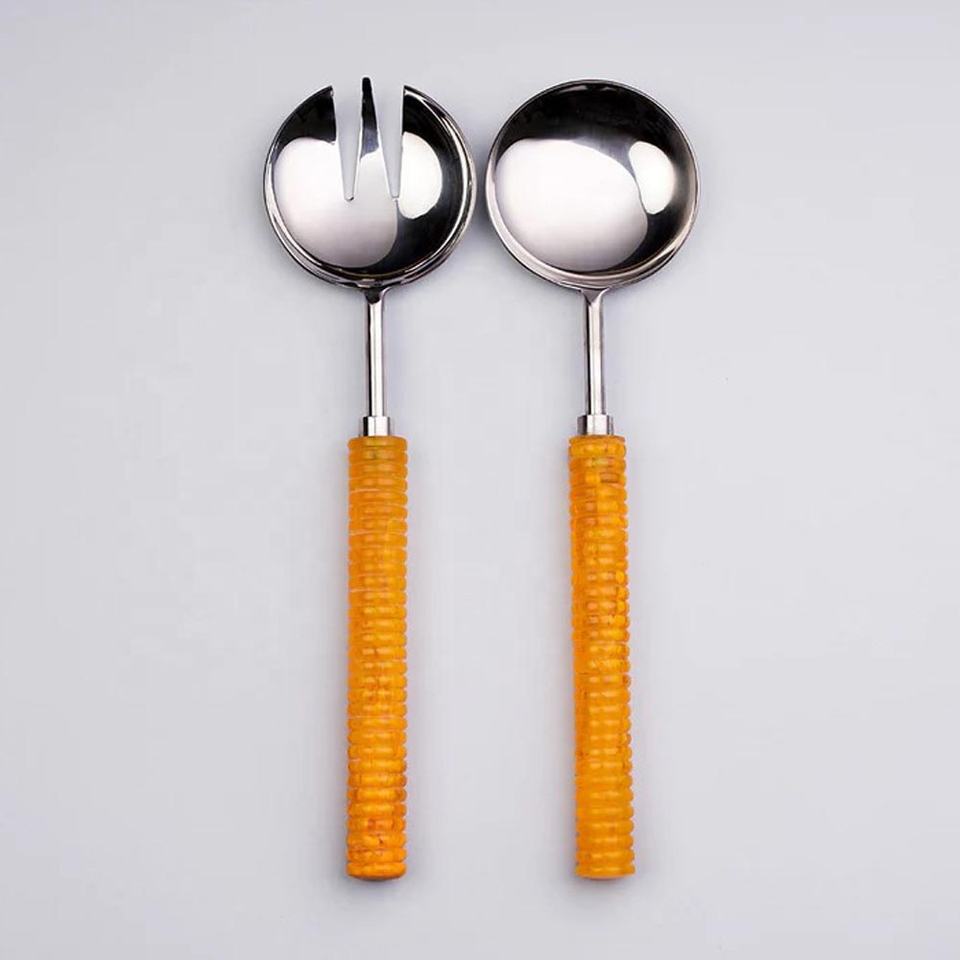 Ensemble de service de salade poli argenté d'acier inoxydable de poignée de résine de conception de doublure multicolore de luxe pour la décoration de table