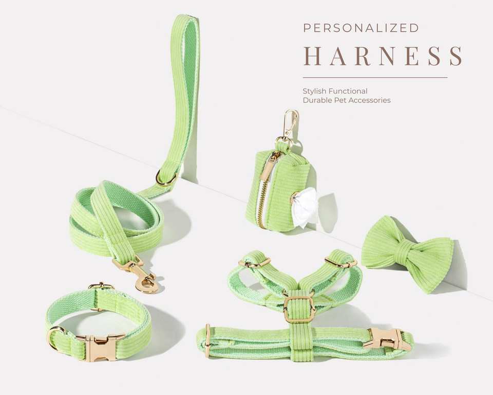 Luxurious And Dispenser,Personalised Green Corduroy Puppy Leash Set,Soft Dog Collar Poo Bag Holder