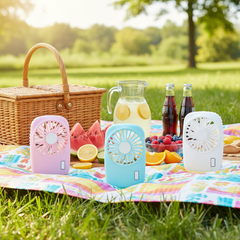 Ventilateur portable rechargeable de luxe bleu brume, format mini, en boîte ondulée, petit ventilateur de refroidissement manuel