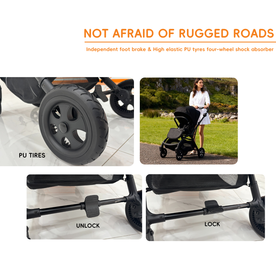 Avantages:Poussette pliable en trois parties ; 360° poussette bébé