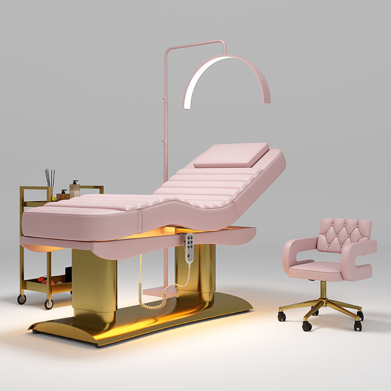 Ensemble de table de massage et de tabouret de luxe avec base dorée, moderne, 4 moteurs électriques, inclinable, lit de beauté esthétique avec lumières