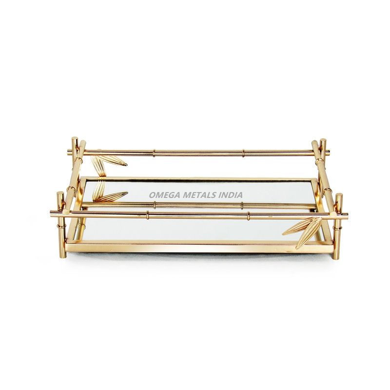 Luxueux plateau de service rectangulaire en or avec base en miroir et accents de feuilles idéal pour afficher les desserts et élever le style