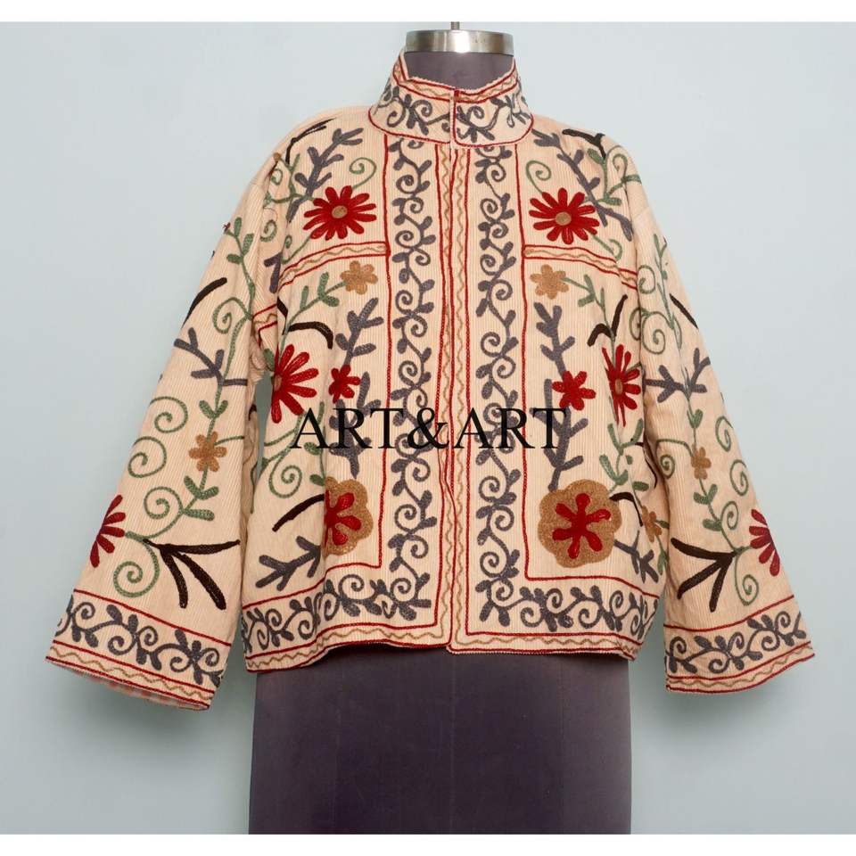 Veste Cotrise matelassée luxueuse brodée à la main en coton 100% avec des détails floraux complexes, élégance intemporelle, automne-hiver