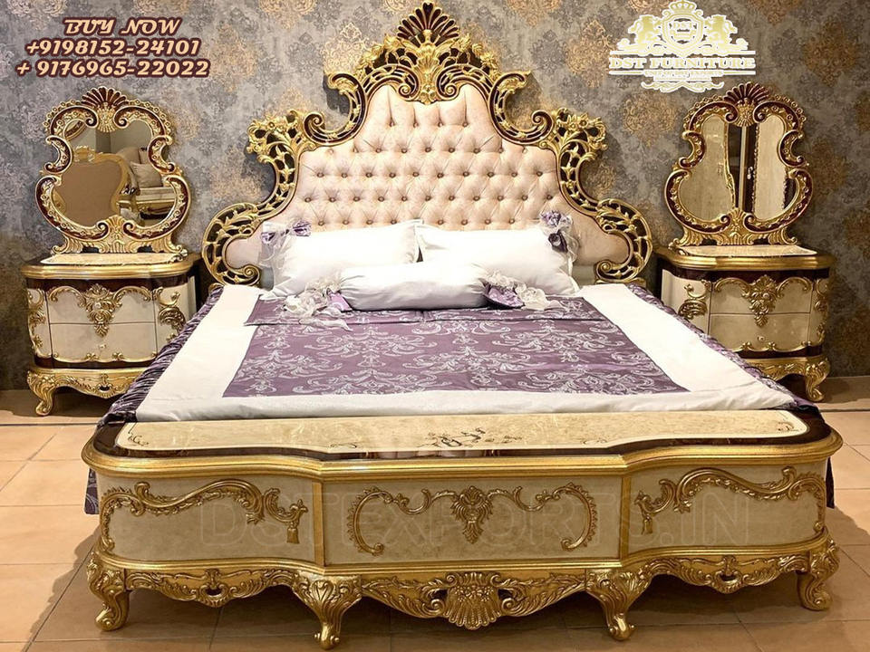 Meubles de chambre à coucher luxueux faits à la main avec finition dorée, ensemble de meubles de chambre à coucher classiques sculptés à la main, villa européenne, lit en bois massif