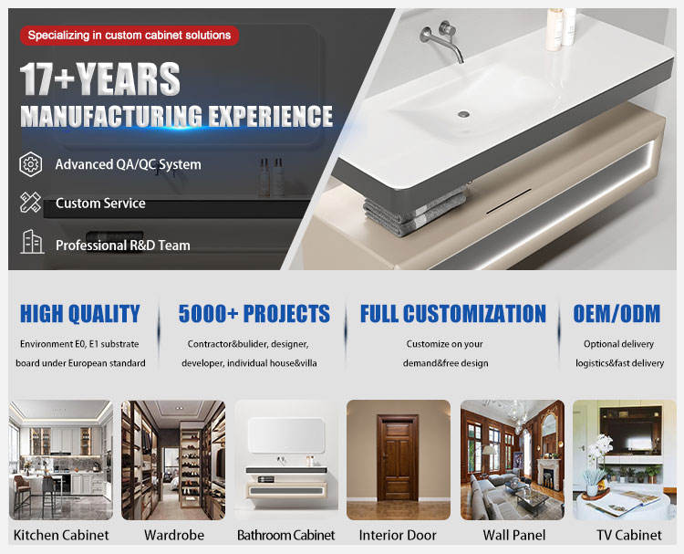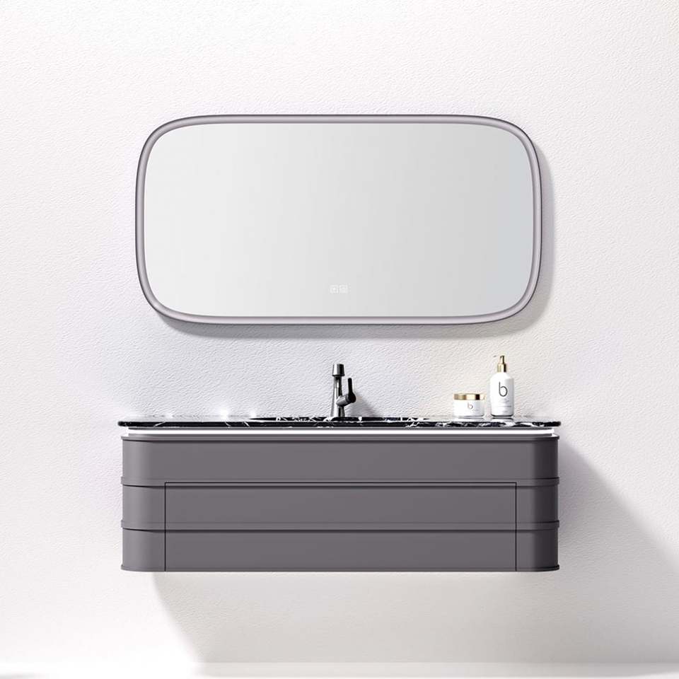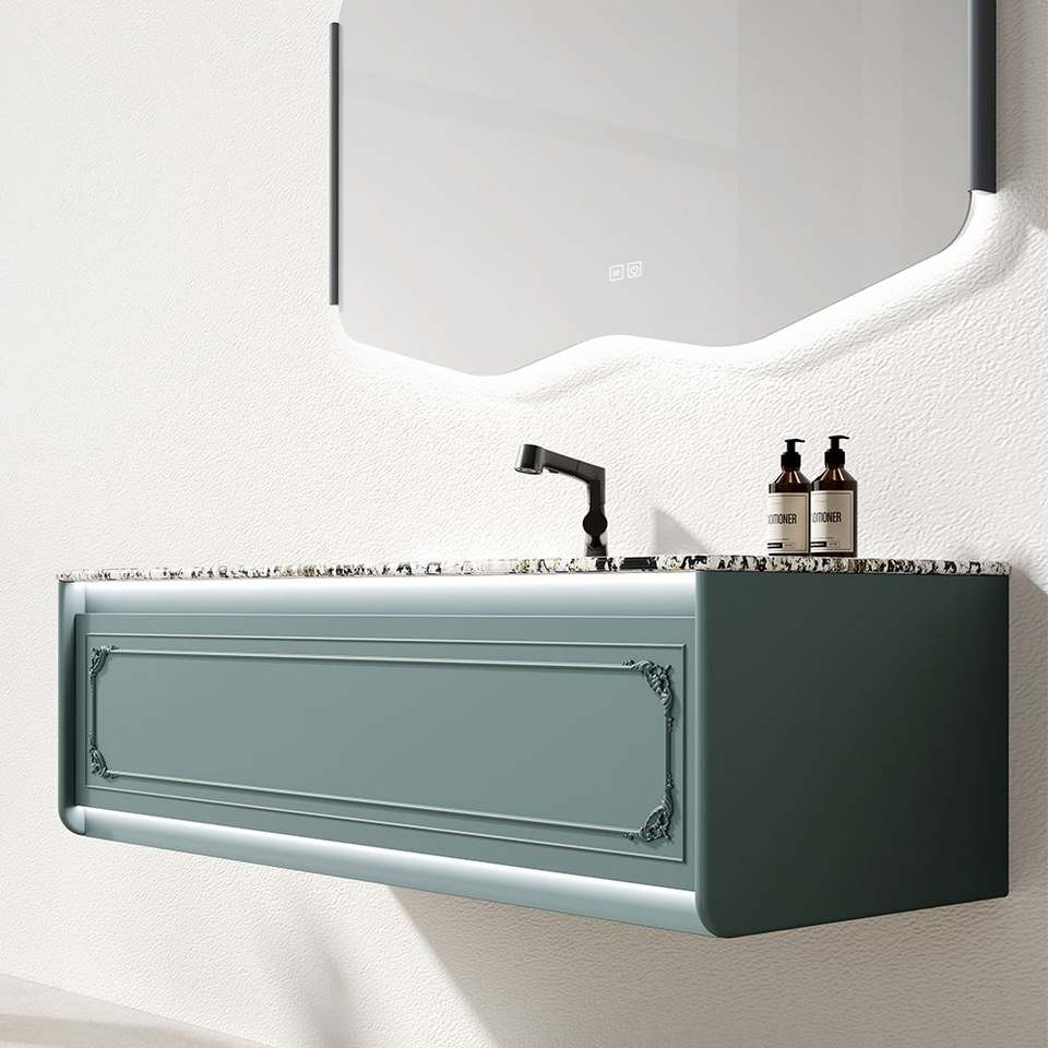 Meuble de salle de bain à vasque unique de style moderne luxueux, finition laquée, contreplaqué, bois massif, vasque murale, miroir LED, villa