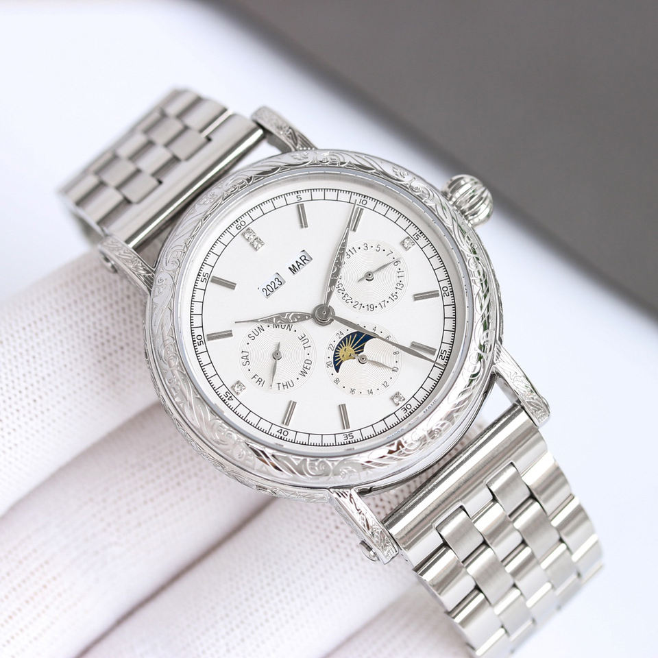 Montre mécanique de luxe à plusieurs cadrans, affichage complet de la date et des phases lunaires, lunette à motif gravé, index sertis de diamants