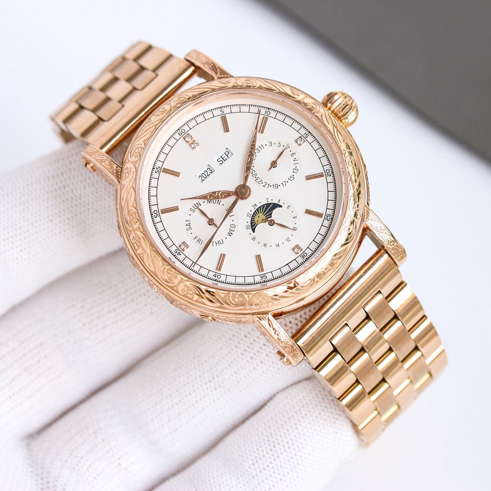 Montre mécanique de luxe à plusieurs cadrans, affichage complet de la date et des phases lunaires, lunette à motif gravé, index sertis de diamants