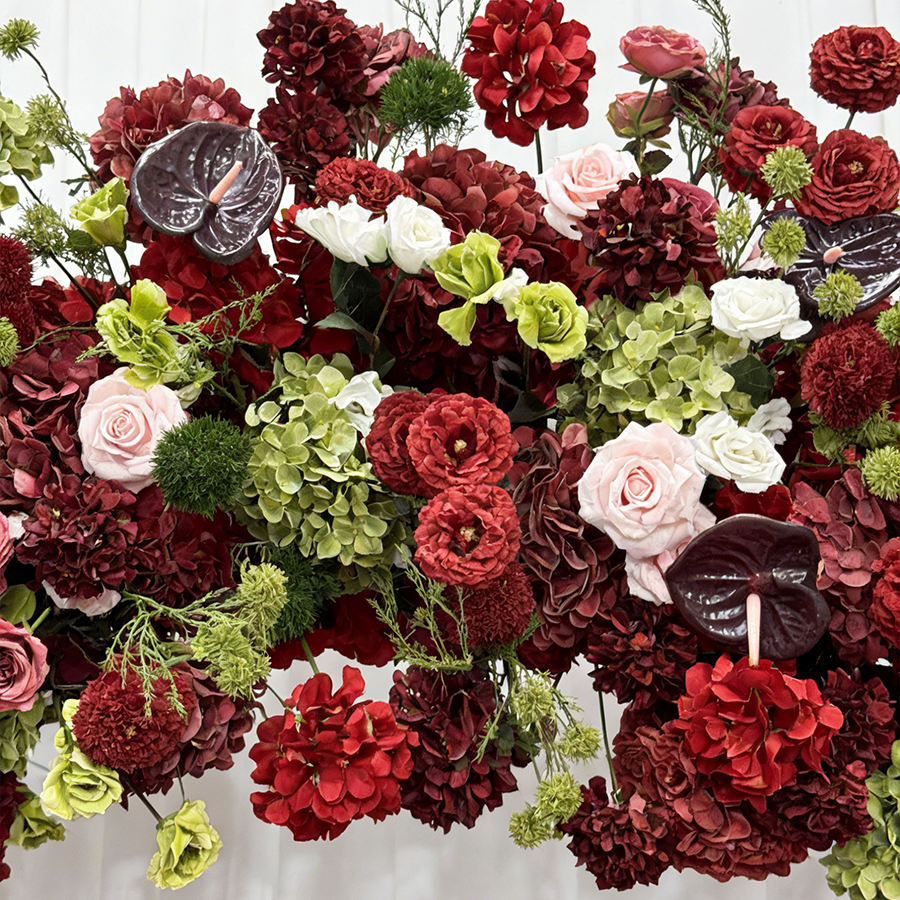 Décor de mariage luxueux et réaliste en fleurs artificielles modernes, roses et hortensias bordeaux et verts, en soie écologique faite à la main