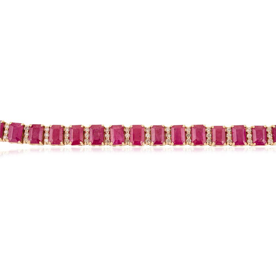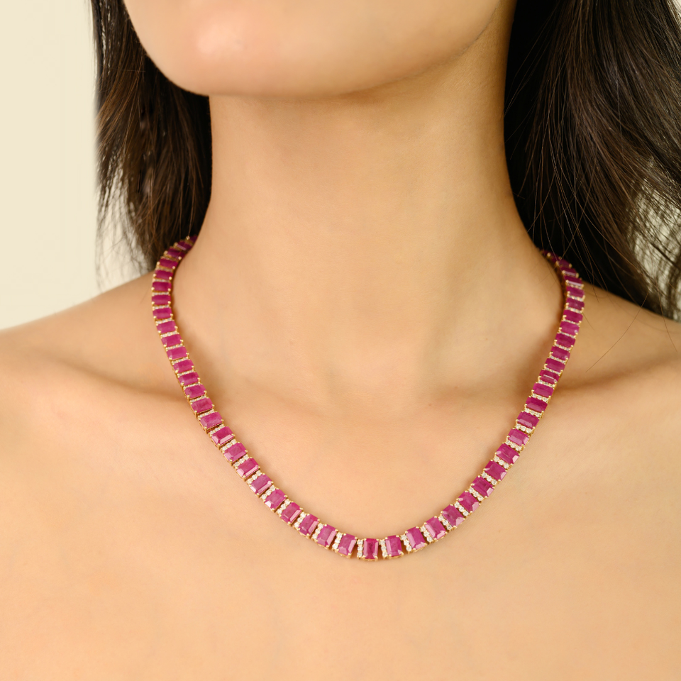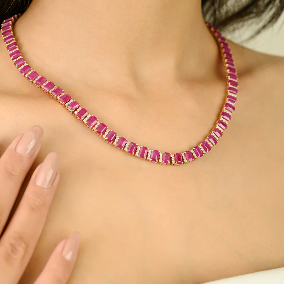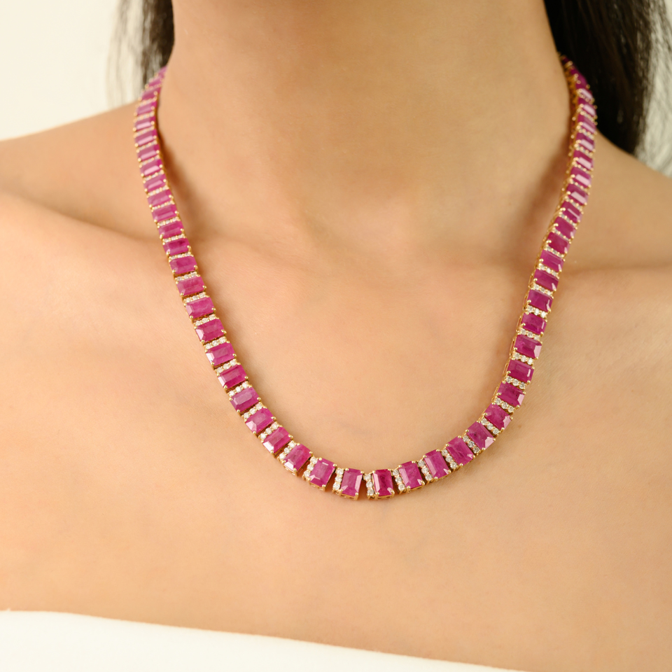 Collier Tennis en Or Jaune Pur K14 avec Rubis Octogonal et Diamants 6x4 mm, Design de Luxe, Bijou de Mariage, Cadeau pour Épouse