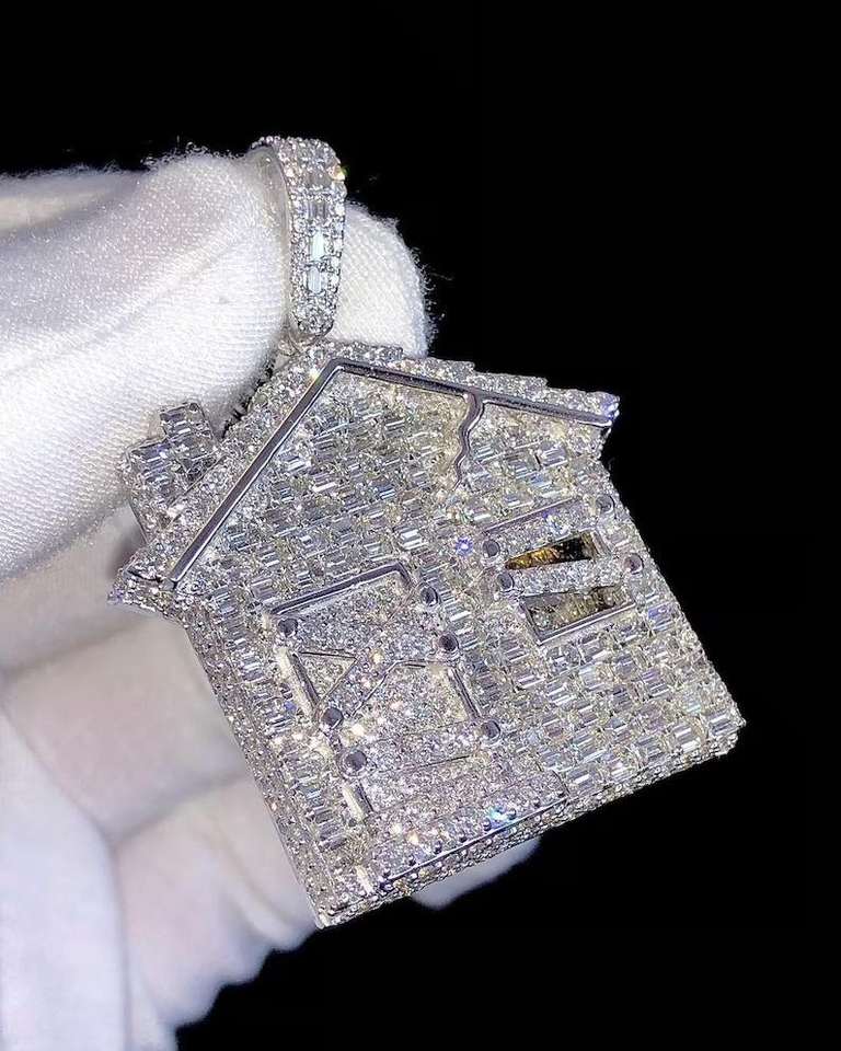 Luxury 12 Carat Iced Out House Moissanite Pendant with Baguette Stones Hip Hop Gold Plated Statement Jewelry White Gold Finish