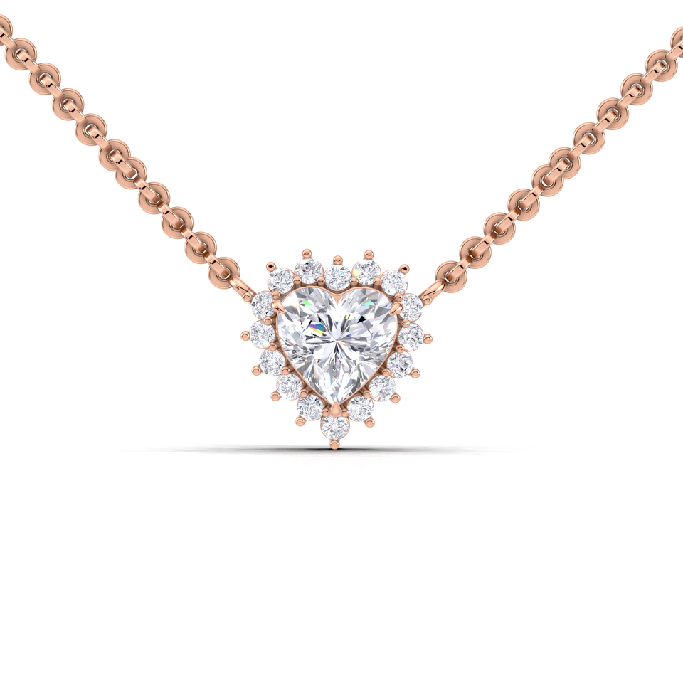 Pendentif de luxe en diamant de laboratoire taille cœur 1 carat avec halo et dos en forme de soleil | Collier en or jaune, blanc et rose 9 carats