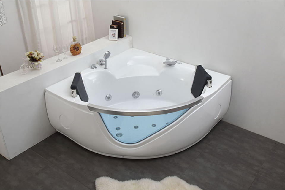 Baignoire balnéo d'angle triangulaire de luxe pour 2 personnes, baignoire spa avec fenêtre en verre pour le développement immobilier et les projets d'appartements de luxe